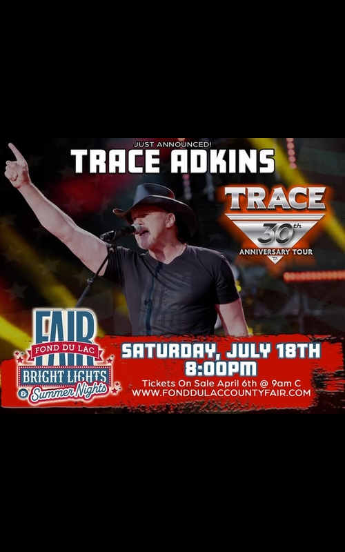 TRACE ADKINS is bringing his 30th Anniversary tour to the National Exchange Bank & Trust stage at the Holiday Automotive Grandstand on July 18th a the Fond du Lac County Fair